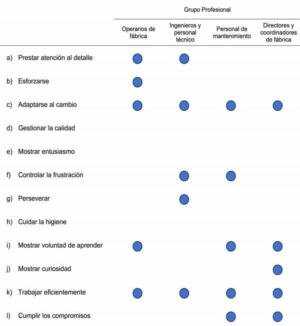 Así en el caso de los operarios se destacaron actitudes como "esforzarse" o "prestar atención al detalle". Existió coincidencia entre los ingenieros y el personal técnico de mantenimiento en considerar también "controlar la frustración". En el grupo de Directores/coordinadores de fábrica se destacó "mostrar curiosidad" o "cumplir con los compromisos".