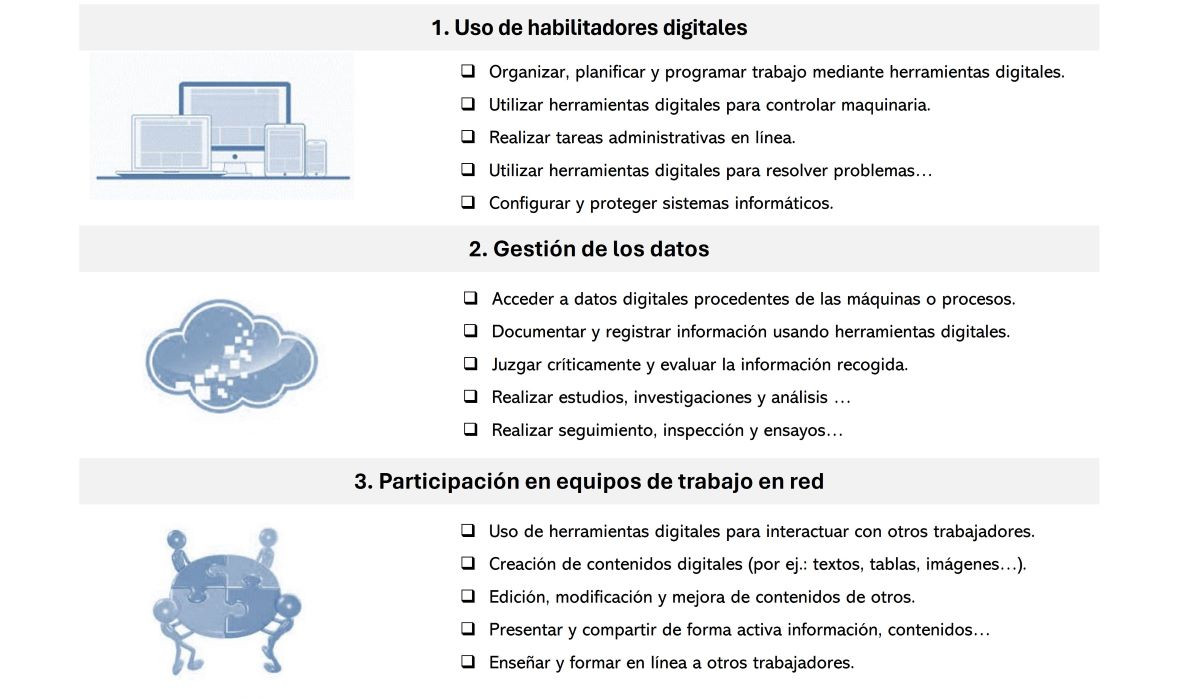 En primer lugar tenemos un conjunto de habilidades relacionadas con el uso de los habilitadores digitales desde los que desempeñan cada vez sus tareas. Otra serie de habilidades estarían relacionadas con la necesidad de gestionar los datos producidos. Y un tercer grupo de habilidades estaría compuesto por aquellas más relacionadas con la participación en equipos de trabajo en red mediante el uso de mediadores tecnológicos.