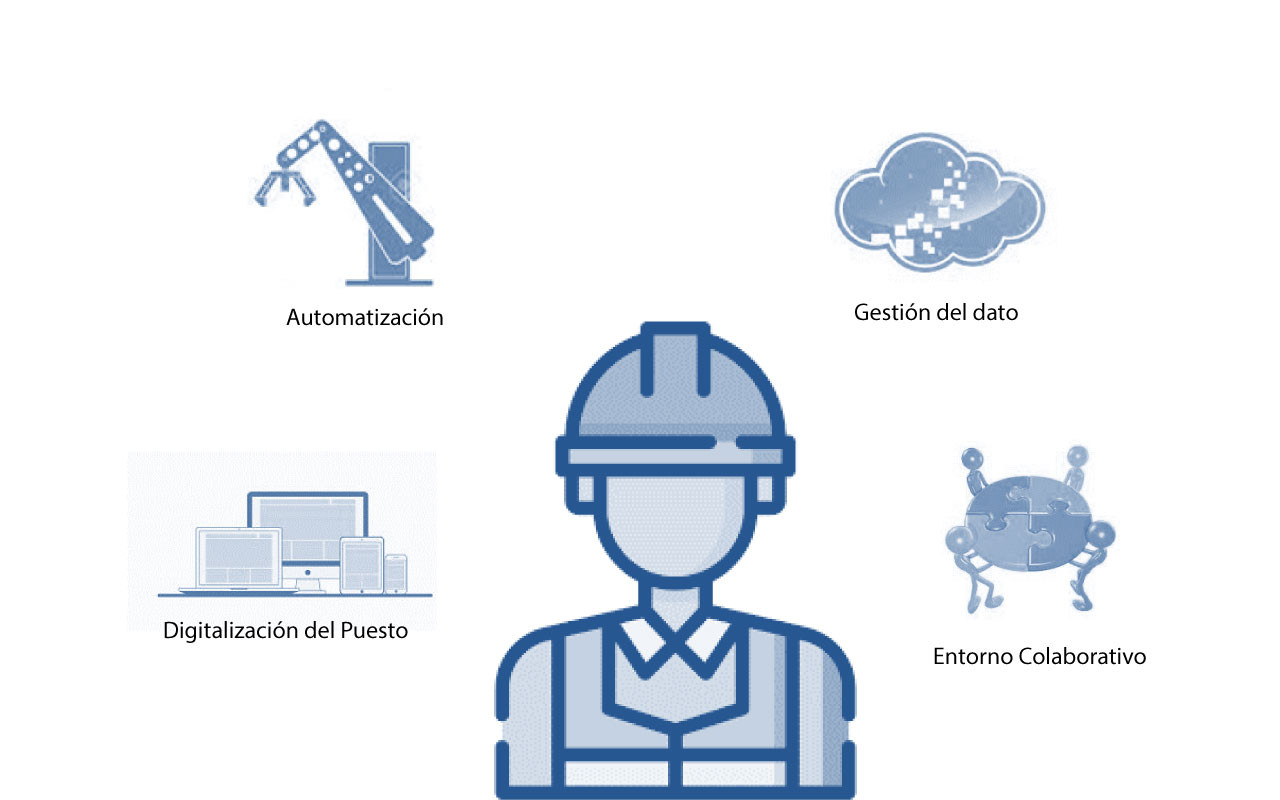 En la triangulación de los resultados, y en especial en las series de entrevistas, emergió la existencia de un conjunto de cambios en el entorno laboral en el que se desarrollaba en trabajo en fábricas y talleres, lo que se definió como nuevo entorno digital de trabajo. Por tal entendemos los factores contextuales que -al calor de la transformación digital de la empresa- tienen capacidad de impactar en las condiciones de trabajo de manera variable en las diferentes ocupaciones y empleos. Estos factores explicativos que se identificaron fueron cuatro (Figura 1):Figura 1. Factores que componen el Nuevo Entorno digital de trabajo
